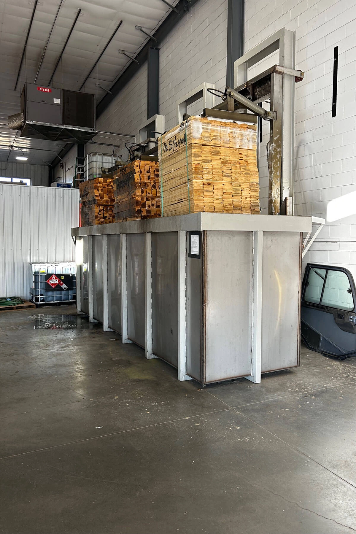 Fox Valley Wood Products uses air-drying sheds that protect against rain and snow while promoting airflow to keep heat treated pallets dry and mold-free.